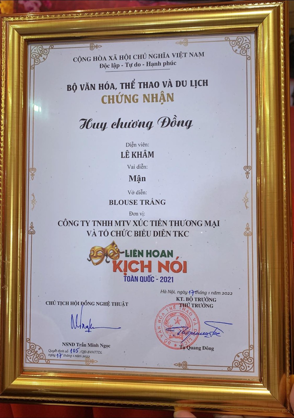 Lê Khâm vừa đoạt huy chương đồng cho vai diễn Mận trong vở "Blouse trắng" thuộc đơn vị sân khấu kịch Trịnh Kim Chi. Nam diễn viên bày tỏ sự biết ơn với nghệ sĩ Trịnh Kim Chi khi đã mời anh cho vai diễn này, để anh có cơ hội thăng hoa trong nghề.