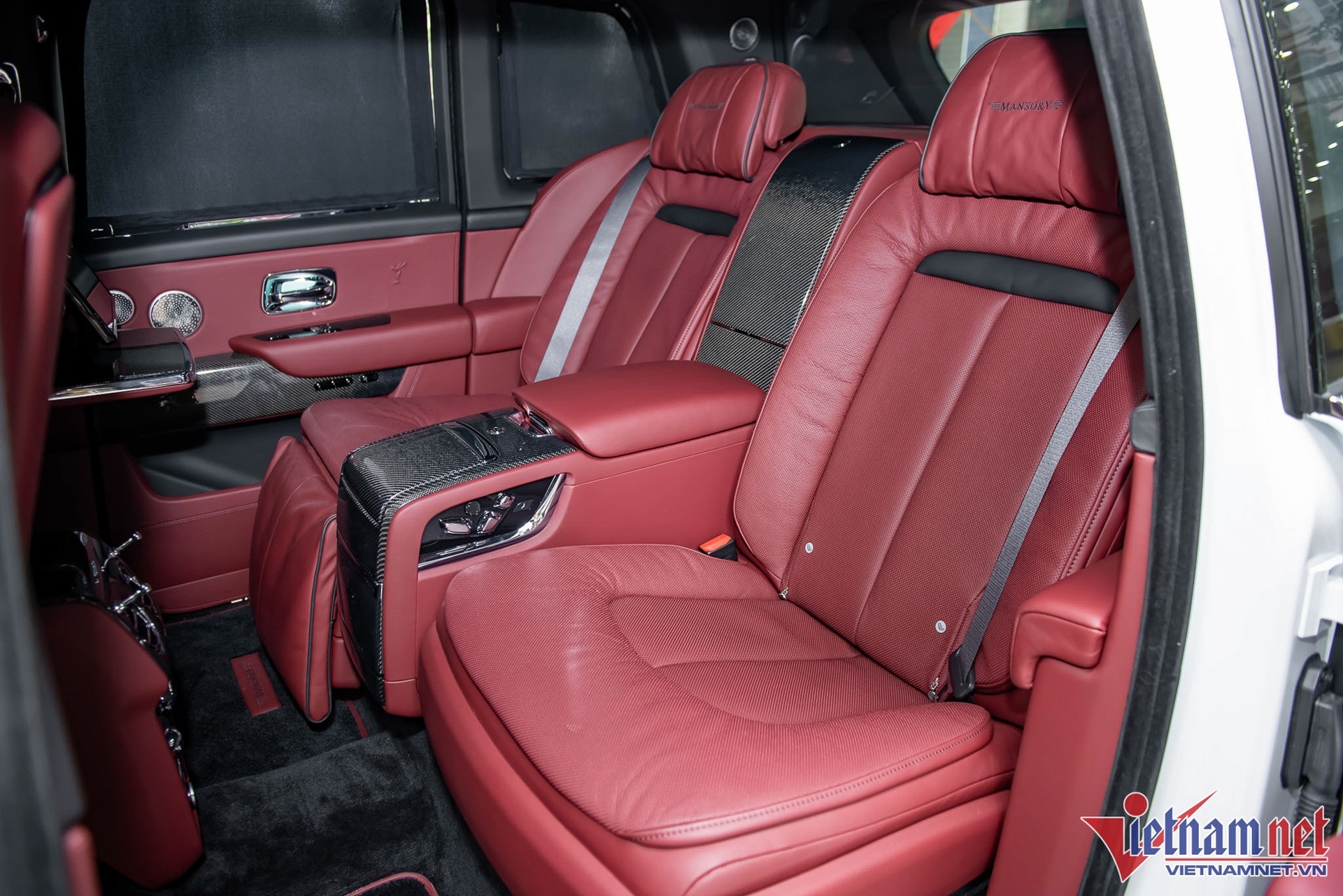 Khoang nội thất của chiếc Cullinan hàng hiếm này là tông màu đỏ chủ đạo, kết hợp cùng những chi tiết bọc da cao cấp màu đen và ốp sợi carbon. Vô-lăng thay thế logo Rolls-Royce bằng huy hiệu Mansory. Hàng ghế sau với cấu hình hai chỗ ngồi độc lập, ngăn cách bằng bệ tỳ tay cố định và hộc chứa ly, tủ lạnh cùng bảng điều khiển ghế hoặc thông tin giải trí.