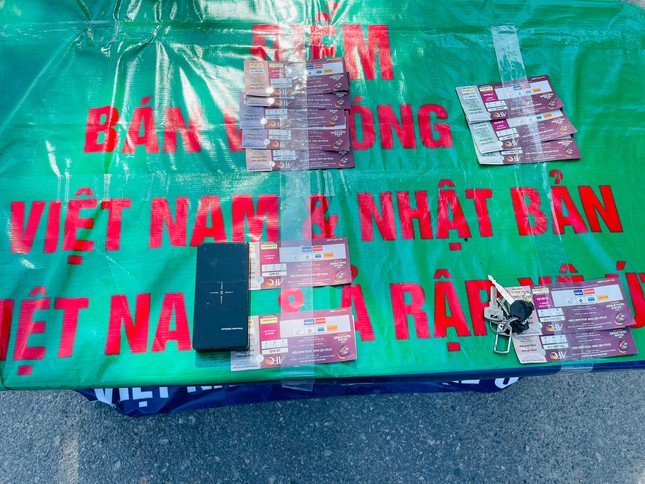 Nhiều phe vé "méo mặt" vì không bán được vé do tâm lý e ngại đến sân xem trực tiếp của người hâm mộ do ảnh hưởng của dịch COVID-19. Trong ảnh là một người tranh thủ bán vé và các vật dụng cổ vũ trước cổng sân Mỹ Đình |